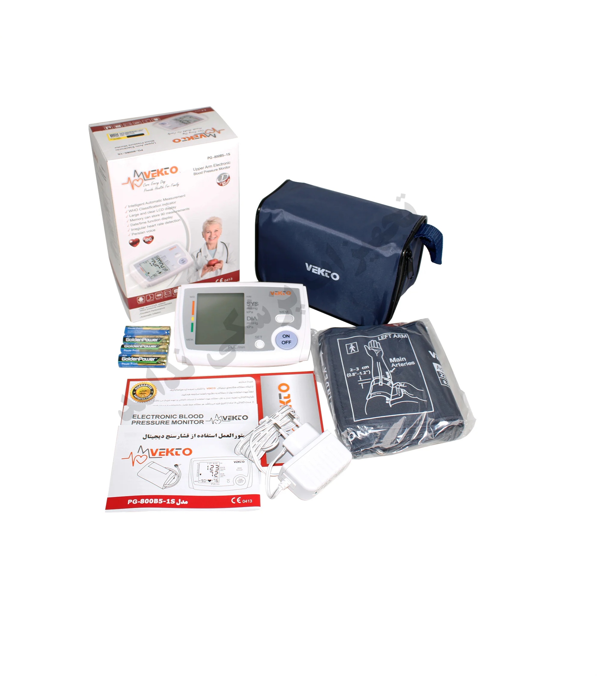 منبع تغذیه باتری و آداپتور قابلیت میانگین گیری فشار فاقد قابلیت هشدار ضربان نامنظم قلب(آریتمی) قابلیت ثبت مشخصات یک کاربر(تک کاربره) قابلیت 90 سری اندازه گیری فشار و ثبت در حافظه قابلیت سخنگو قابلیت خاموشی خودکار، پس از 1 دقیقه بلا استفاده ماندن اقلام همراه: کیف حمل، باتری نیم قلمی، آداپتور، دفترچه راهنما، کارت گارانتی، کاف یا بازوبند (22 تا 32 سانتیمتر) دارای 12 ماه گارانتی و خدمات پس از فروش برند وکتو
